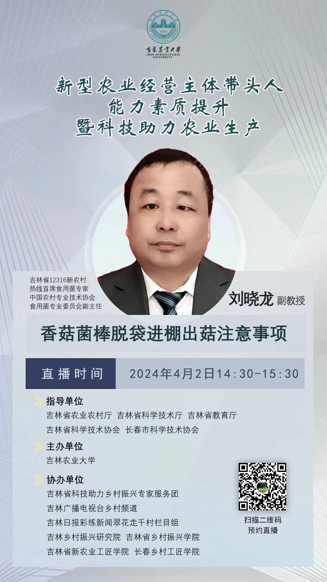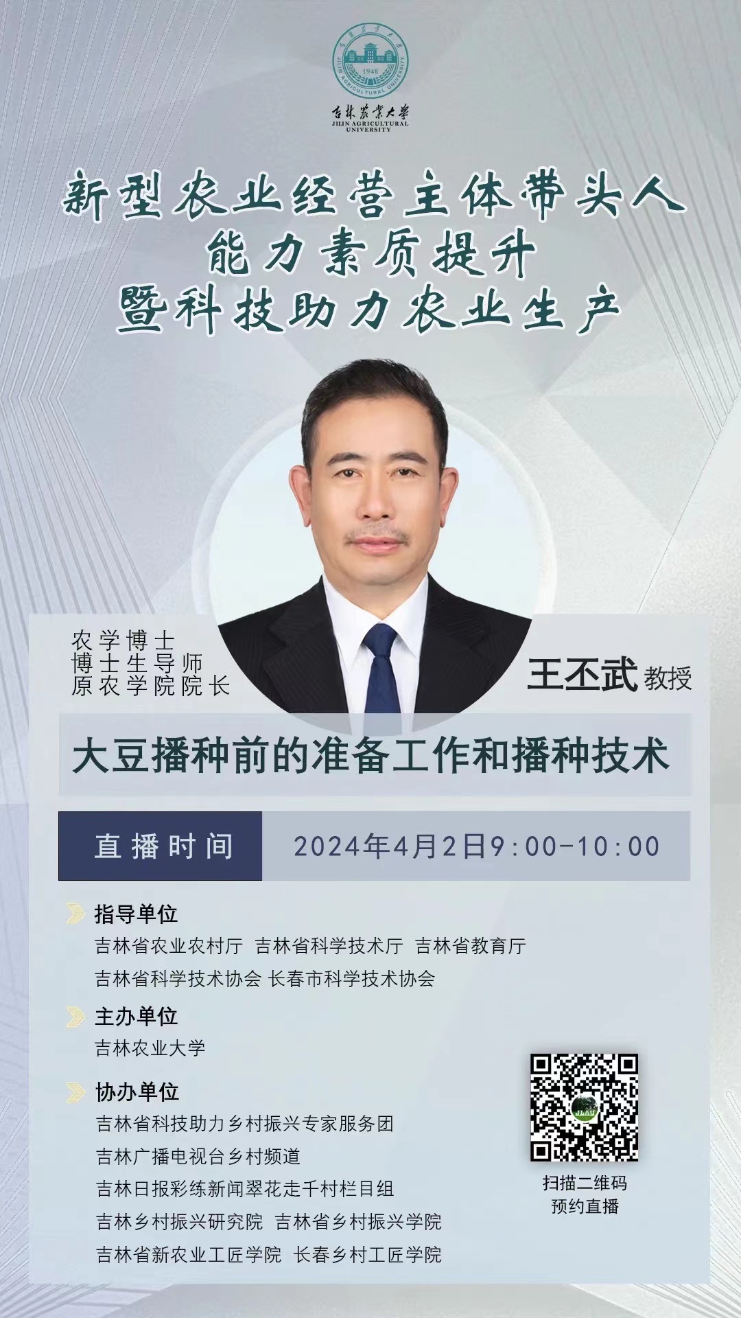 与此同时,为充分发挥科技和智力助农优势,4月2日,吉林农业大学还开展新型农业经营主体带头人能力素质提升暨科技助力农业生产行动。活动第一期以网络直播课堂的形式进行,由吉林农业大学东北亚特色种质资源保育创新中心常务副主任王丕武、吉林农业大学植物保护学院副教授刘晓龙,为大家讲解大豆播种前的准备工作和播种技术和香菇菌棒脱袋进棚出菇注意事项。4月3日,吉林农业大学水稻研究所所长凌凤楼、吉林农业大学资源与环境学院教授杨靖民,将分别对水稻种子处理及苗床土的配置技术和春耕春种期间如何合理施用化肥进行详细讲解。