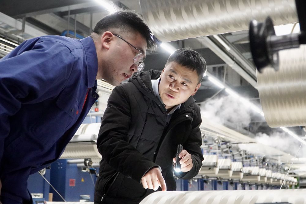 12月19日,科创专员付中禹与企业技术人员检查碳纤维原丝生产线。新华社记者 孙逸轩 摄