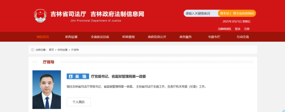 近日,吉林省司法厅官网更新显示,吴强已任省司法厅党组书记、省监狱管理局第一政委。