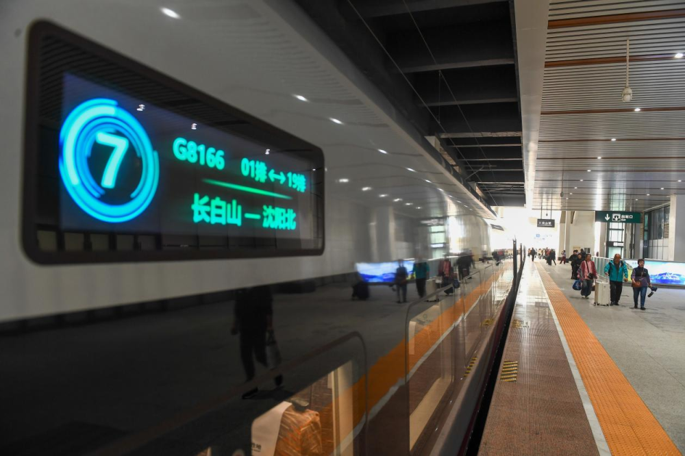 9月28日,旅客在长白山站陆续登上G8166次列车。(新华社记者 张楠 摄)