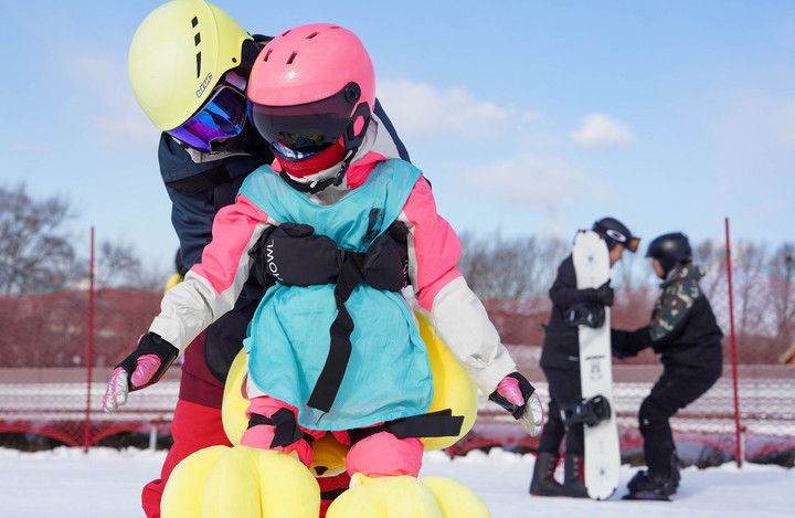 12月3日,吉林市小学生在吉林市纳美山谷度假区学习单板滑雪。