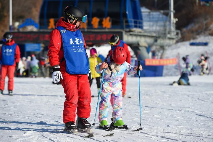 12月3日,在长春市天定山滑雪场,教练教学生和家长滑雪。