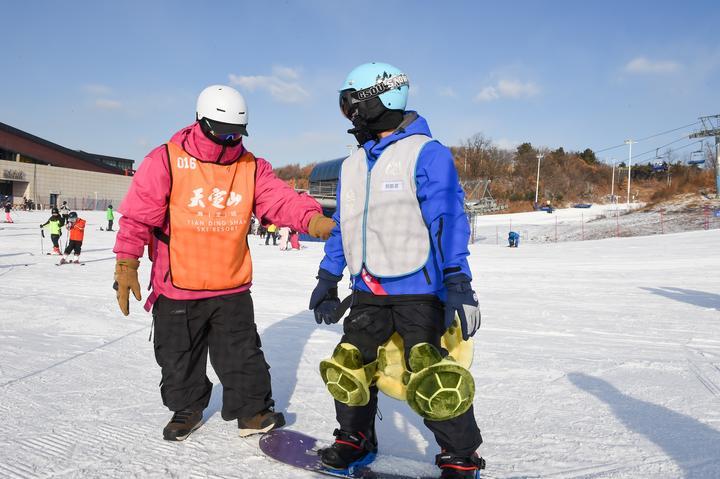 12月3日,在长春市天定山滑雪场,教练教学生滑雪。