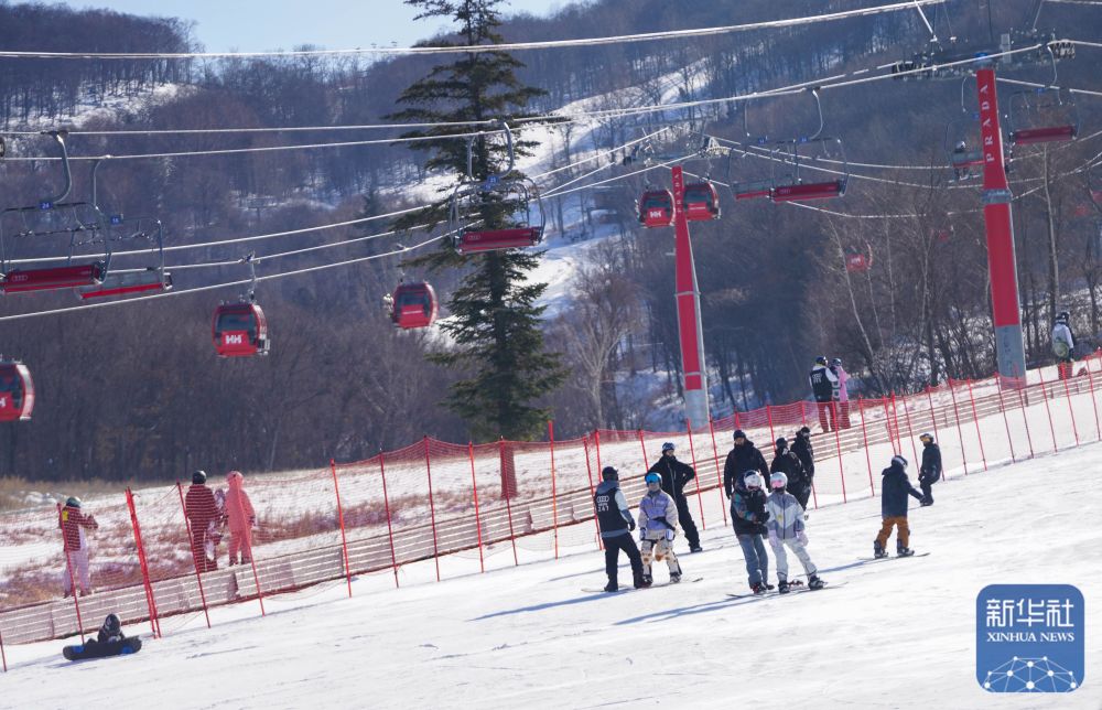 ↑ 滑雪爱好者在吉林市北大湖滑雪度假区滑雪。