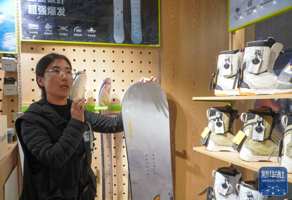 ↑ 在吉林北大湖滑雪度假区商业街内的一家国产品牌雪具店内,工作人员展示我国自主研发生产的滑雪板(2024年11月15日摄)。