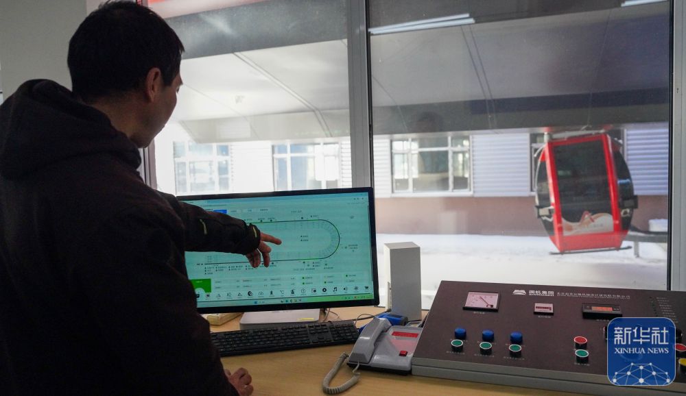 ↑ 在吉林市北大湖滑雪度假区缆车站,工作人员王玉强使用智能化装备监控缆车运行。