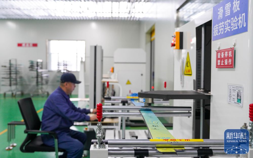 ↑ 在吉林化纤国兴复合材料有限公司的车间内,工作人员用机器设备检测公司自主研发生产的碳纤维滑雪板。
