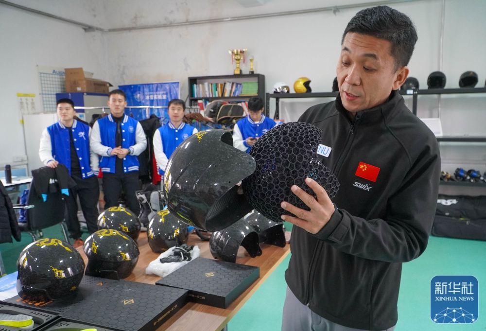↑ 吉林省冰雪运动重点实验室主任刘俊一展示实验室自主研发的3D打印定制化头盔(2024年11月14日摄)。