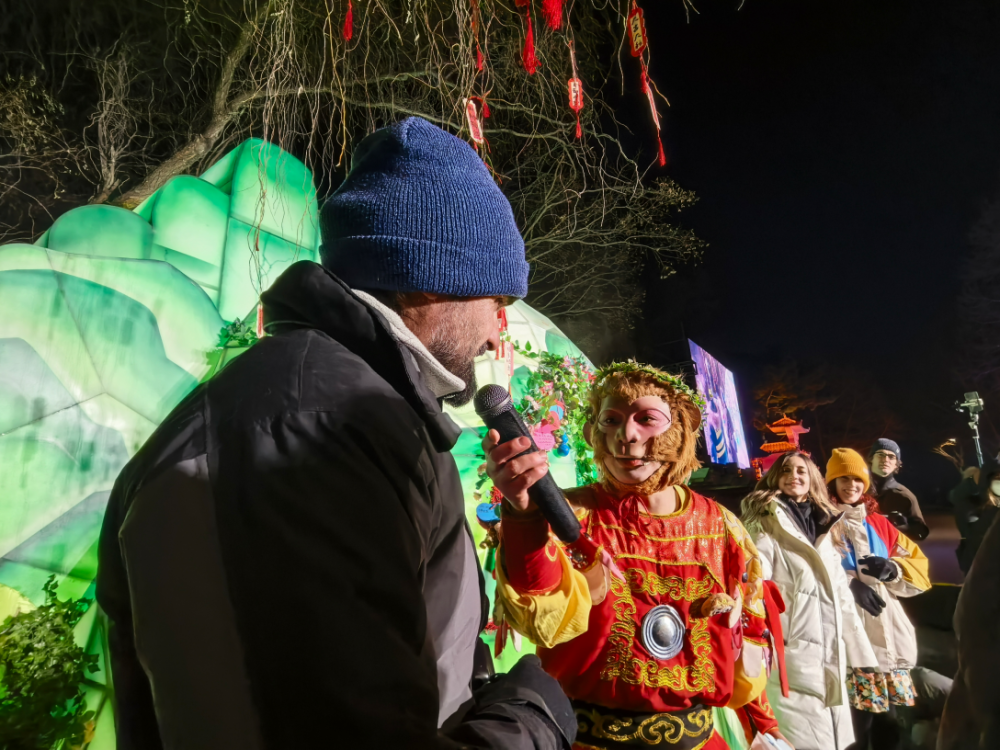 “铁柱,我是从加拿大来的,一直非常喜欢你!”夜幕降临,冬季长春室外温度降至零下15摄氏度,长春市动植物公园“五行山”前,人头攒动,国内外游客共同领略中国四大名著之一《西游记》的魅力,加拿大网络达人阿莲(ALEXANDRA LOUISE OGDEN)与长春市动植物公园NPC“雪饼猴”互动,共同推介吉林文旅和冰雪长春,引来更多人围观和沉浸式体验长春的文化夜生活。