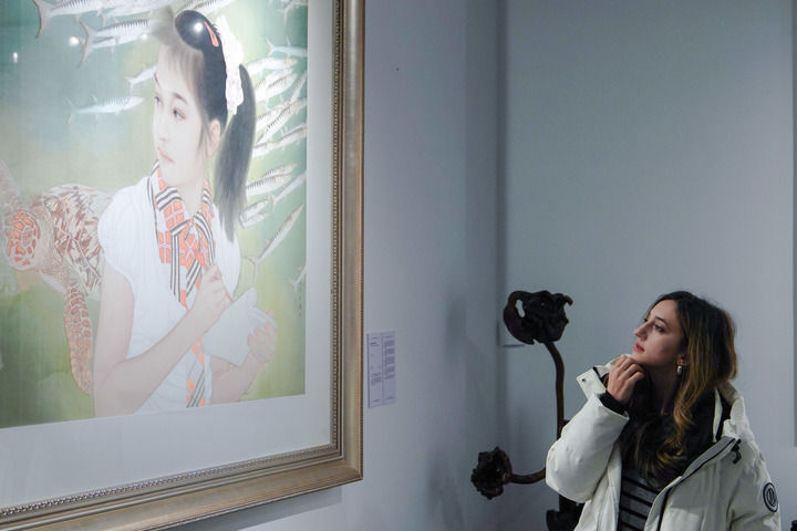 12月17日,外国媒体记者在长春市春京西历史文化街区参观吉林省首届书画名家作品展。