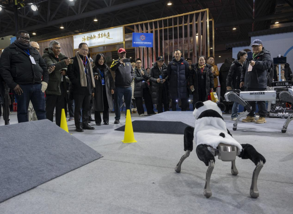 12月18日,驻华使节代表团成员在第九届吉林冰雪产业国际博览会观看四足机器人动作演示。新华社记者 傅天 摄