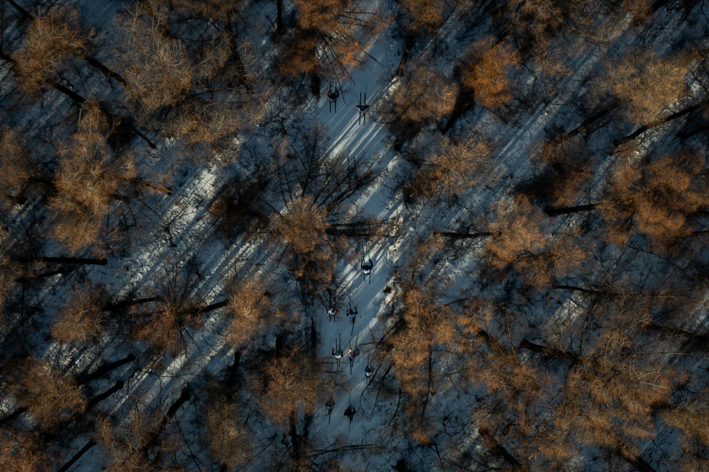 2026年1月4日,第二十四届中国长春净月潭瓦萨国际滑雪节在长春市净月潭国家森林公园正式拉开帷幕,参赛选手在比赛中(无人机照片)。新华社记者 许畅 摄