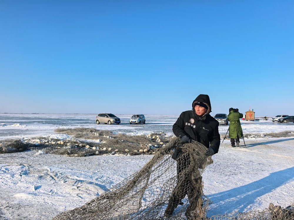 湖面上,零下二十几摄氏度的气温,叠加卷着冰碴呼啸而来的寒风,不一会儿就把人的脸吹得生疼,让人手脚活动困难。这样的严寒,对于渔把头和渔民们来说已是家常便饭。