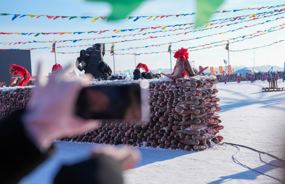 在1月8日的吉林·查干湖第24届冰雪渔猎文化旅游节开幕式现场,游客正在拍摄“鱼墙”照片。新华社记者 颜麟蕴 摄