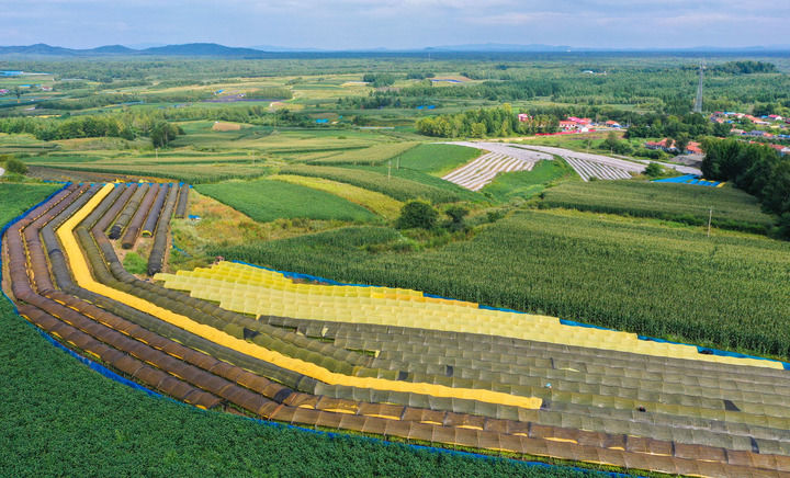 在吉林省抚松县万良镇大方村旁拍摄的人参种植大棚(无人机照片)。 新华社记者 许畅 摄