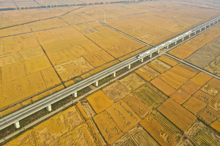 在吉林省公主岭市,一列高铁列车在田间穿行(无人机照片)。 新华社记者 张楠 摄