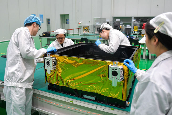 在吉林省长春市,长光卫星技术股份有限公司科研人员将制作完成的多层隔热组件包覆在卫星外壳部件上。 新华社记者 许畅 摄