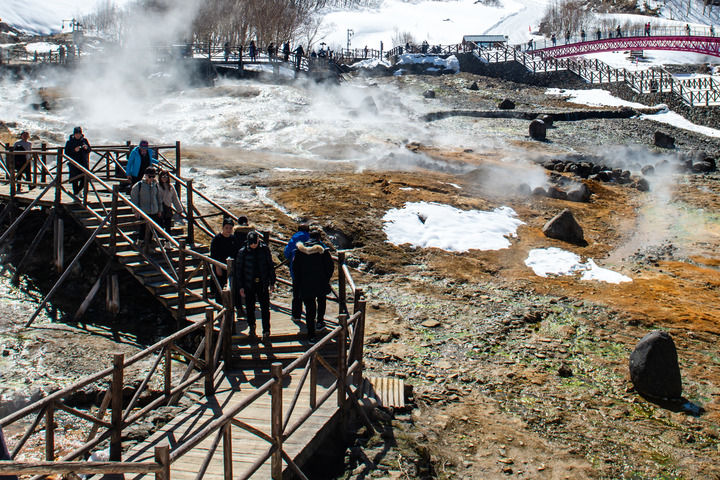游客在长白山北景区观赏火山自溢温泉(3月26日摄)。