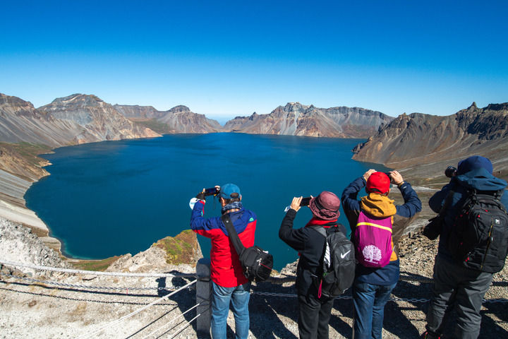 游客在长白山天池拍照留念(2022年9月20日摄)。